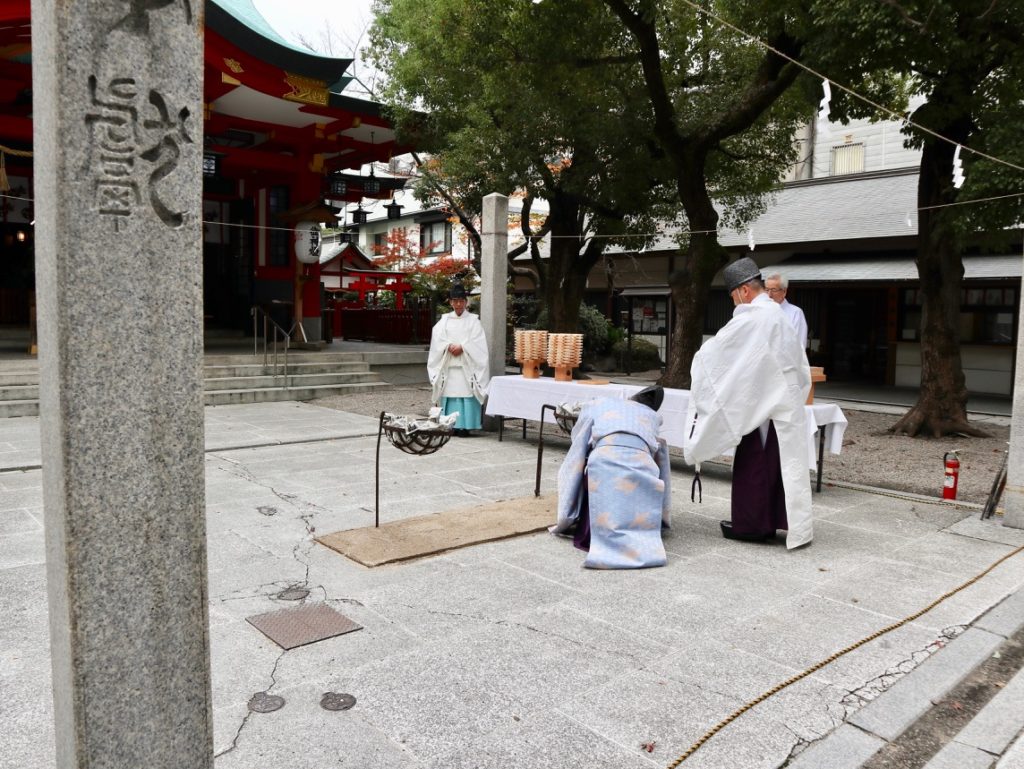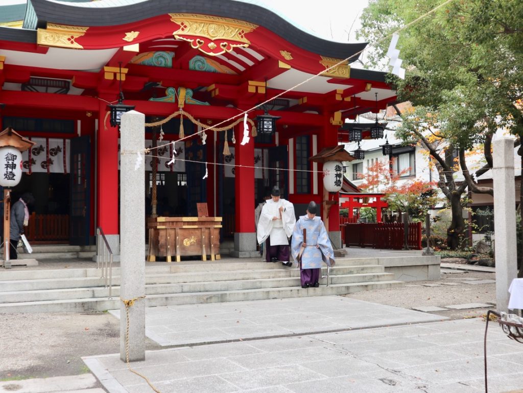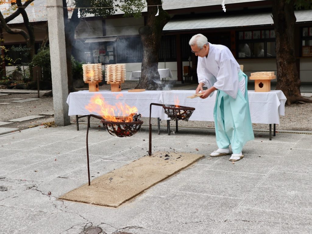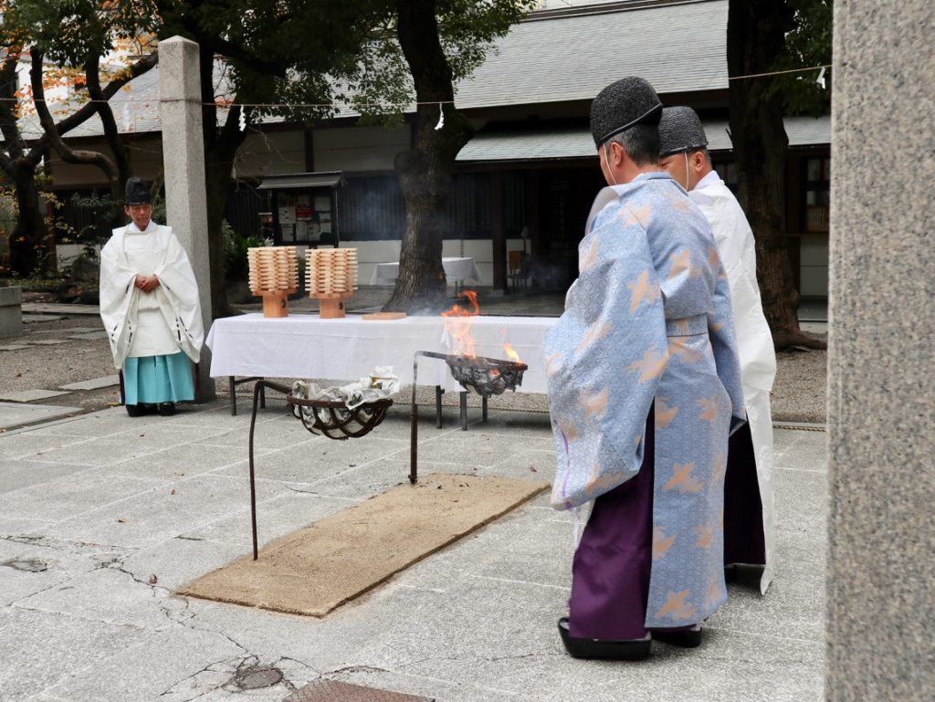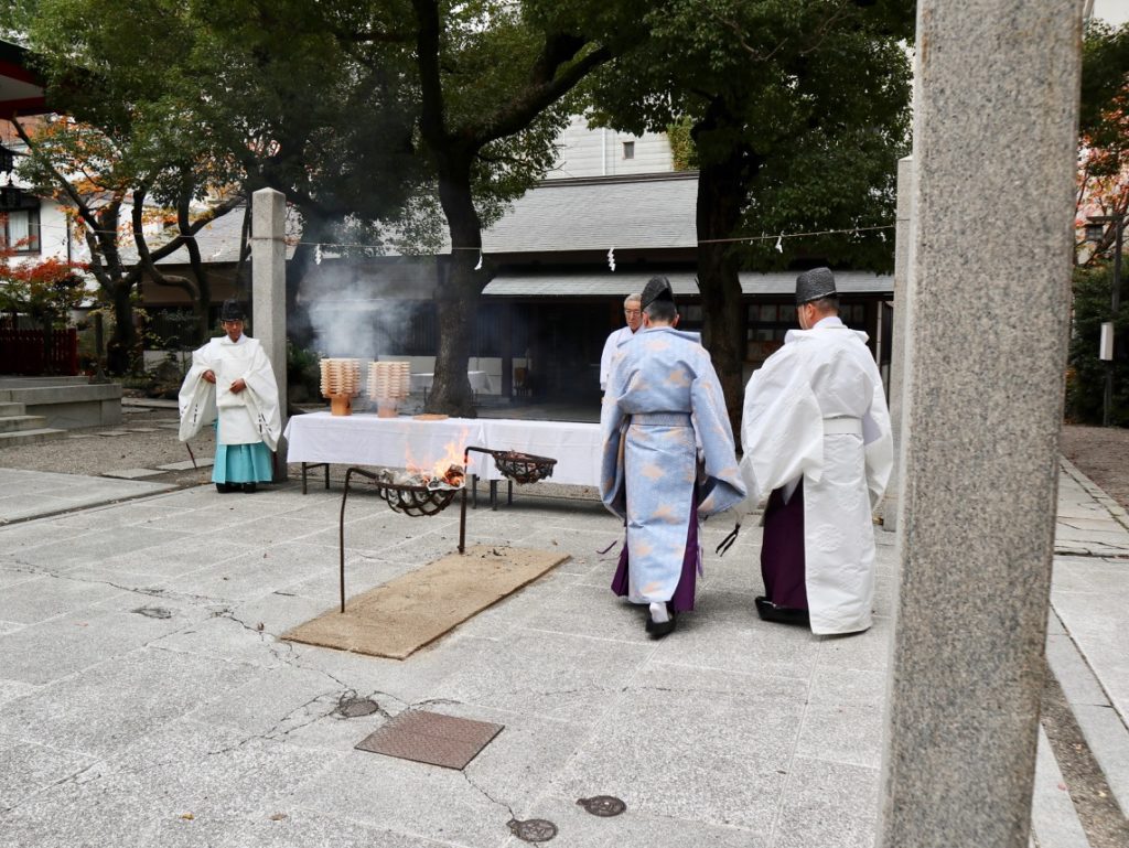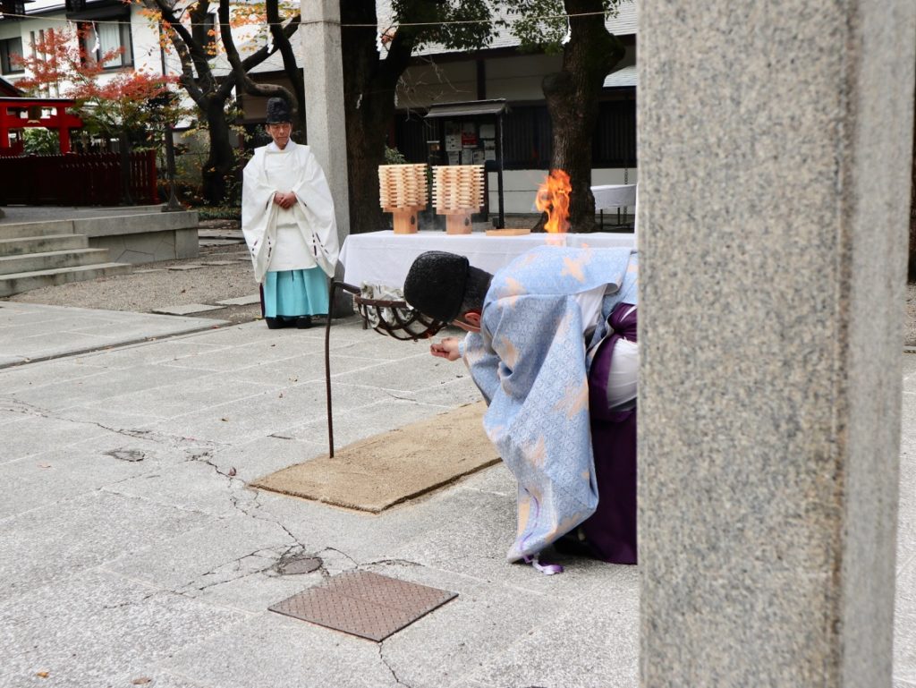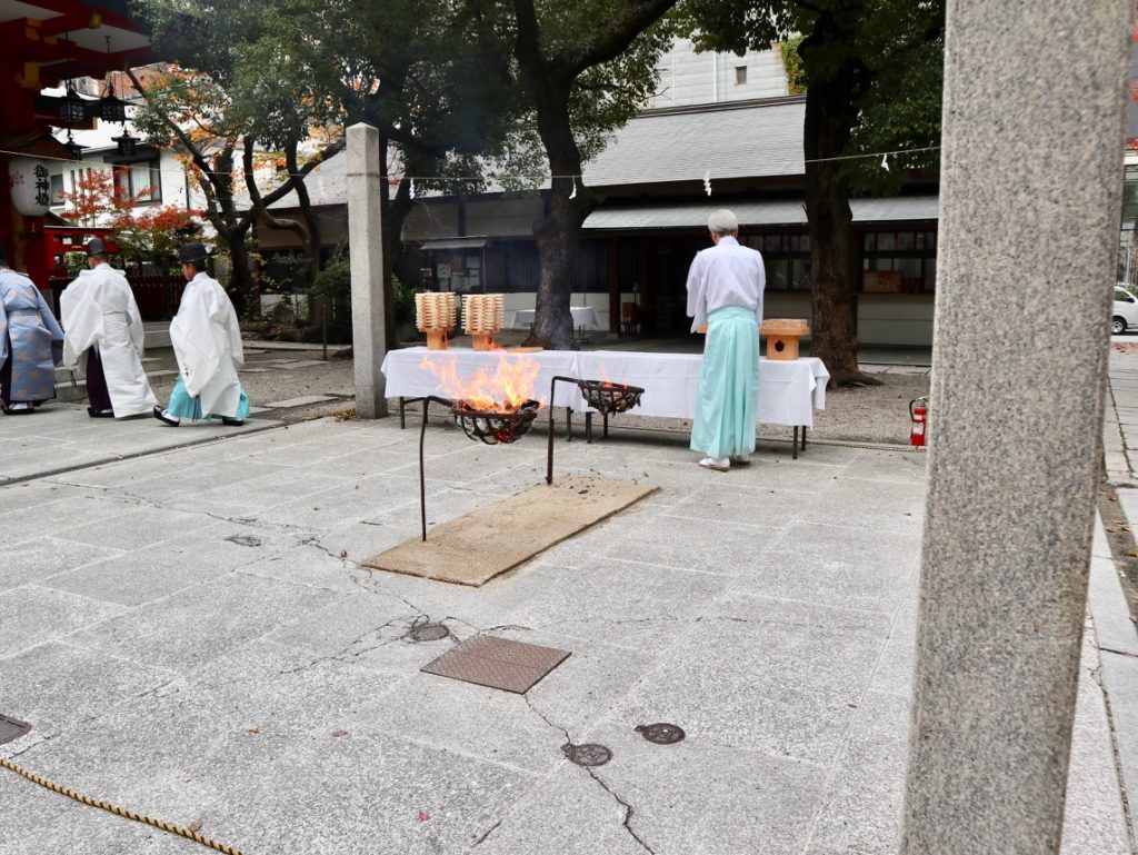 午前11時、「お火焚き祭」の開始時間に御霊神社に行ってみると、拝殿の中ではすでに厳かな神事が行われている様子でした。「お火焚き祭」は火の神様へ、火に対する感謝と安全を祈願するお祭りだそうです。