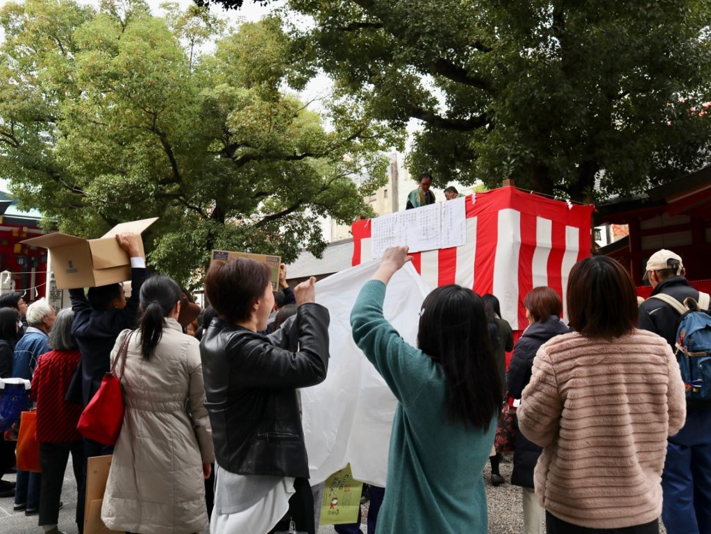 神事中もすでに境内では待っている様子の人がちらほら。私も境内で待っていると…
