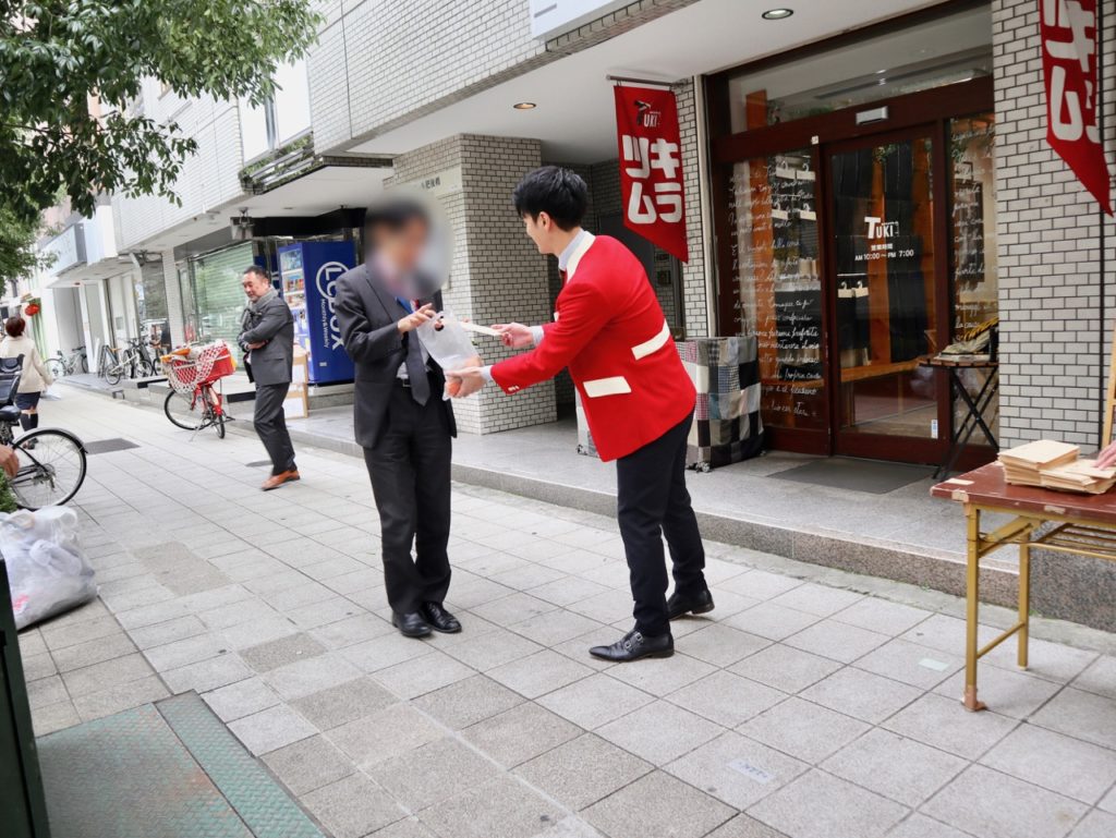 お店の前で野菜を配っていた岸専務にお話を伺いましたが、なんと今回の企画は御霊神社のみかんまきがあることを知って、合わせて同日同時刻に企画したとのこと!ぶつけてきてたんですね…!!