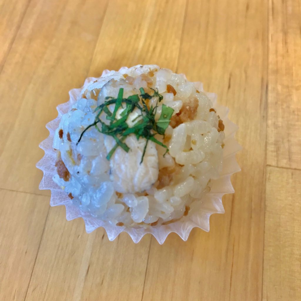 鶏そぼろおにぎり。上にのった大葉はあり、なし選べます。