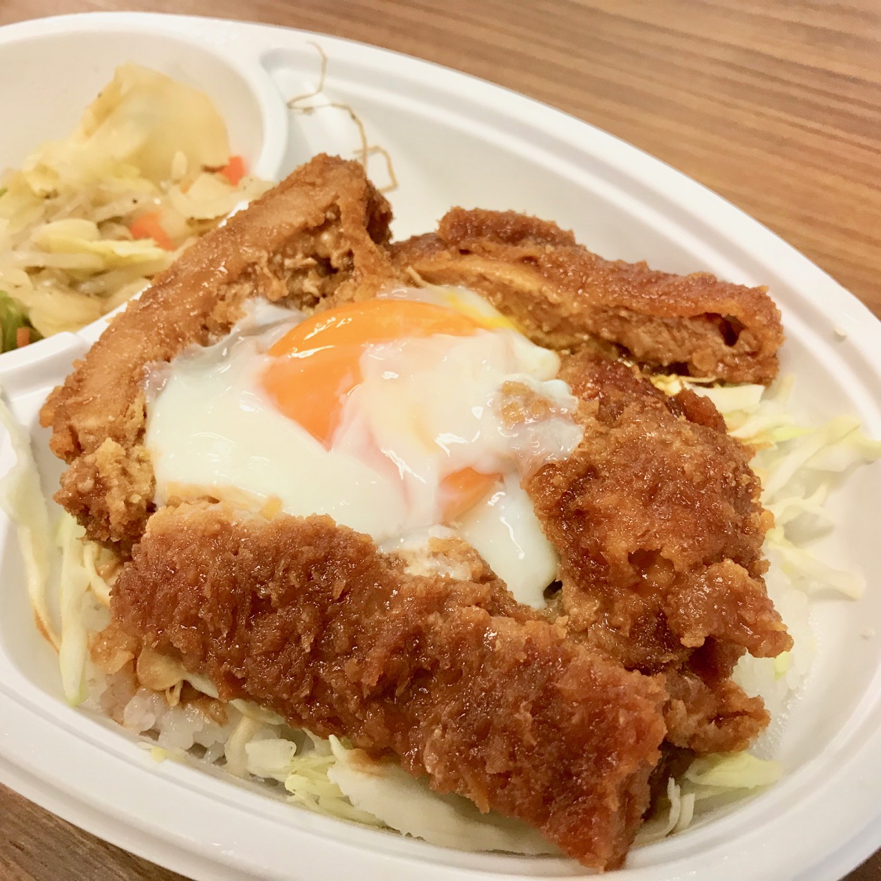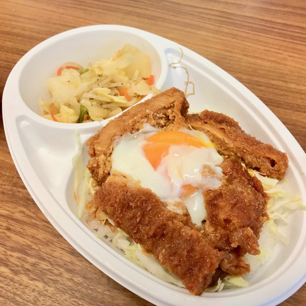 がっつりソース味なトンカツの真ん中に半熟温泉卵、下にはキャベツ…と隙のない構成です。