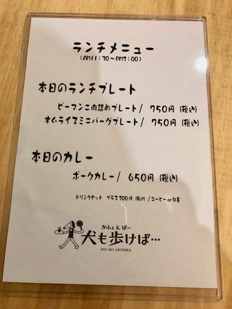 「かふぇとばー 犬も歩けば…」というお店で、モーニング(8時〜11時)、ランチ(11時30分〜14時)、バー(18時〜23時)の三部制で営業してるみたいです。