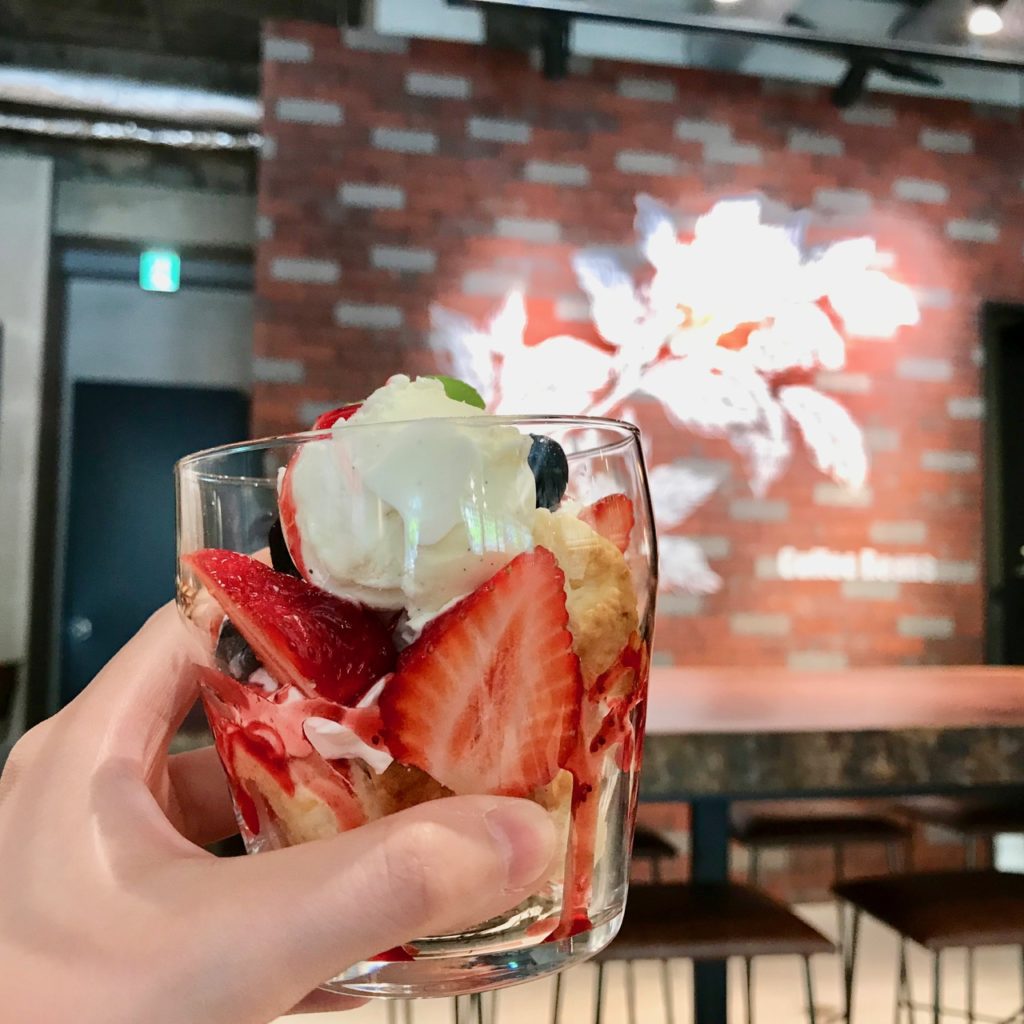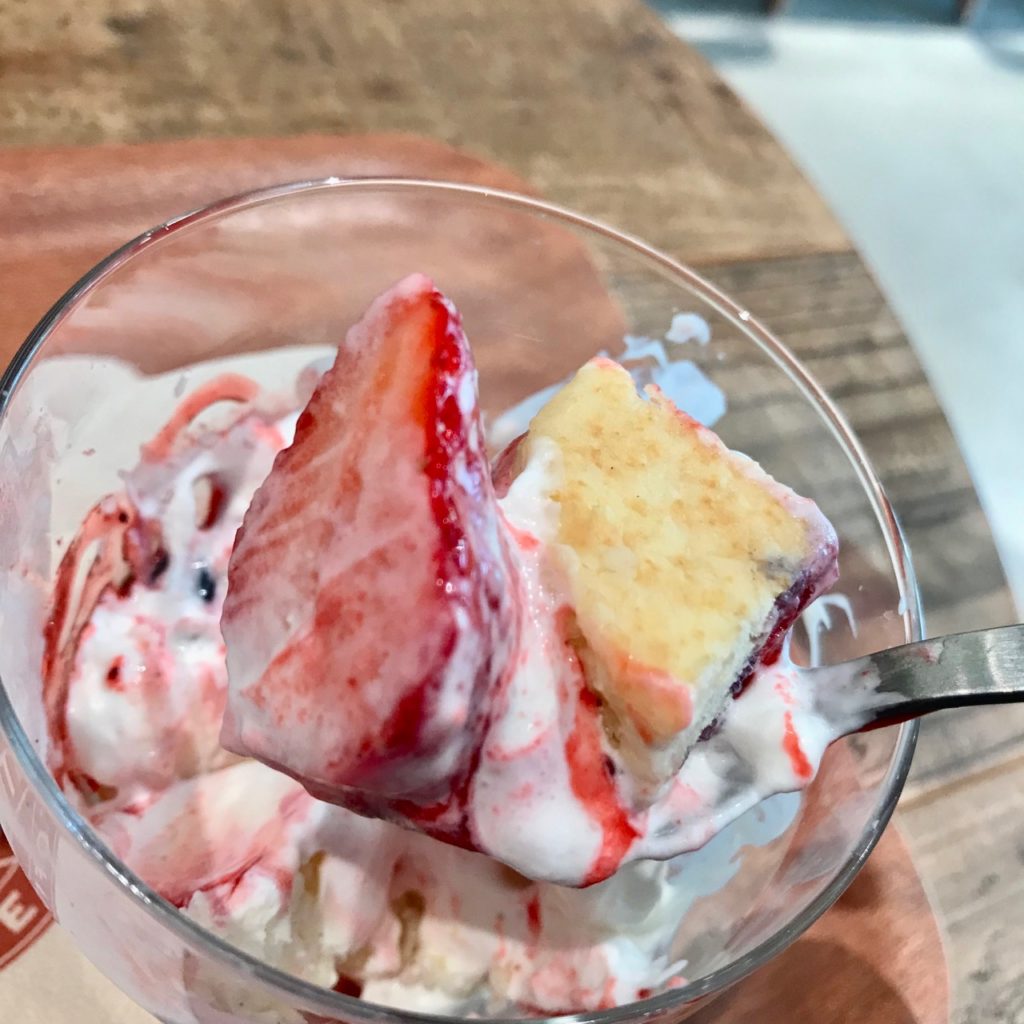 イングリッシュスコーンとイチゴ、シロップ漬けのブルーベリー、アイスクリーム、生クリーム、ベリーソースがグラスに入っています。