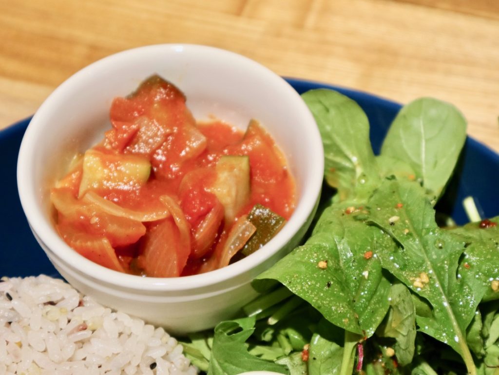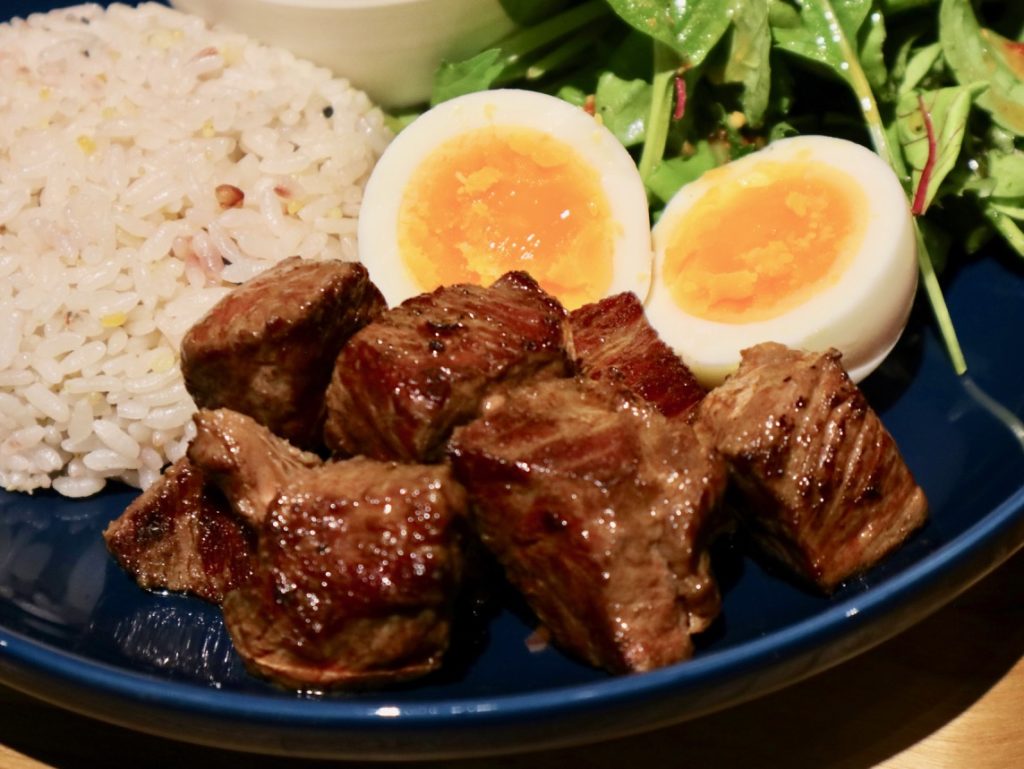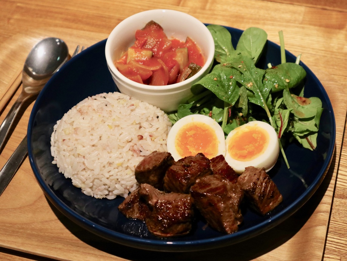 カットステーキ、ゆで卵、サラダ、野菜のトマト煮込み、十六穀米…とヘルシーながらボリュームもしっかりなワンプレートです!