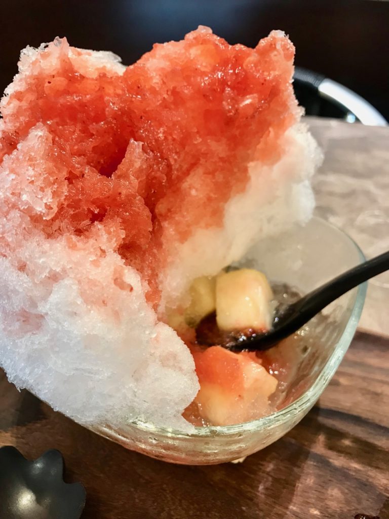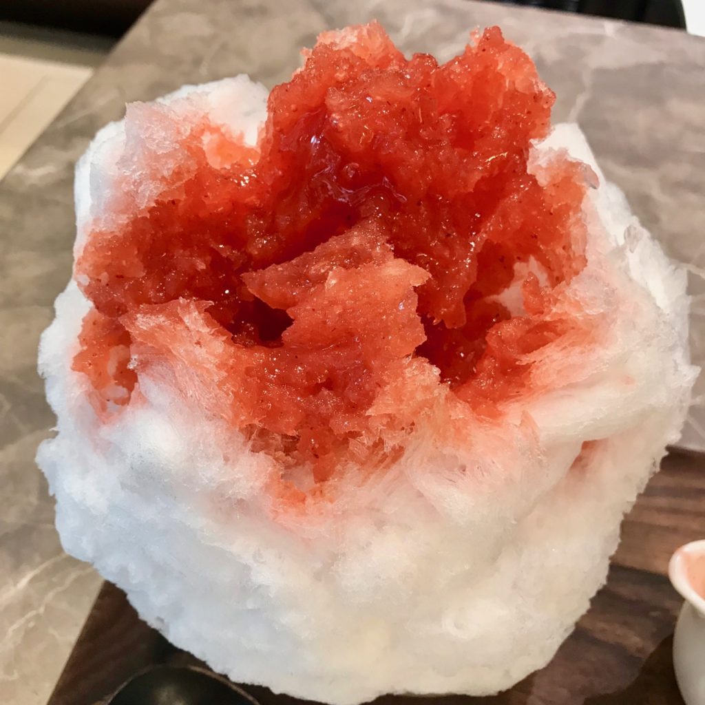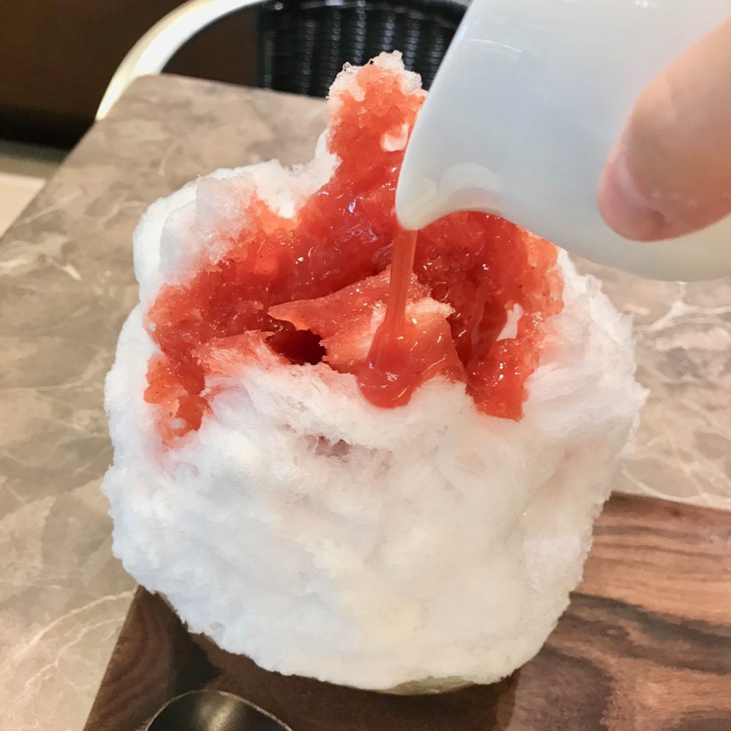 真っ白なかき氷に真っ赤なシロップ…「桃と白ワイン」っぽさは見た目からはわかりませんね?