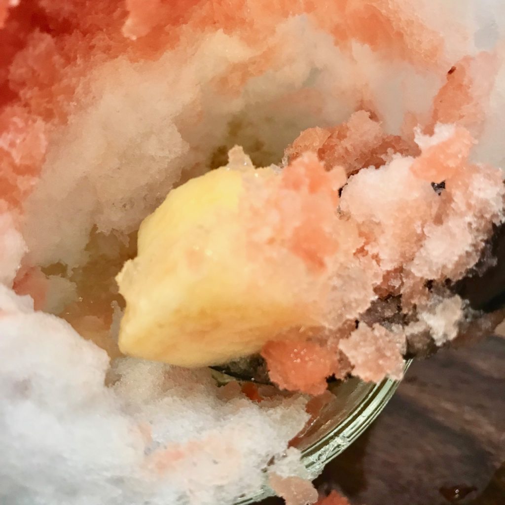 掘っていくとゴロゴロと桃が登場して、氷やシロップと混ぜながら食べると色んな味バランスが楽しめます。