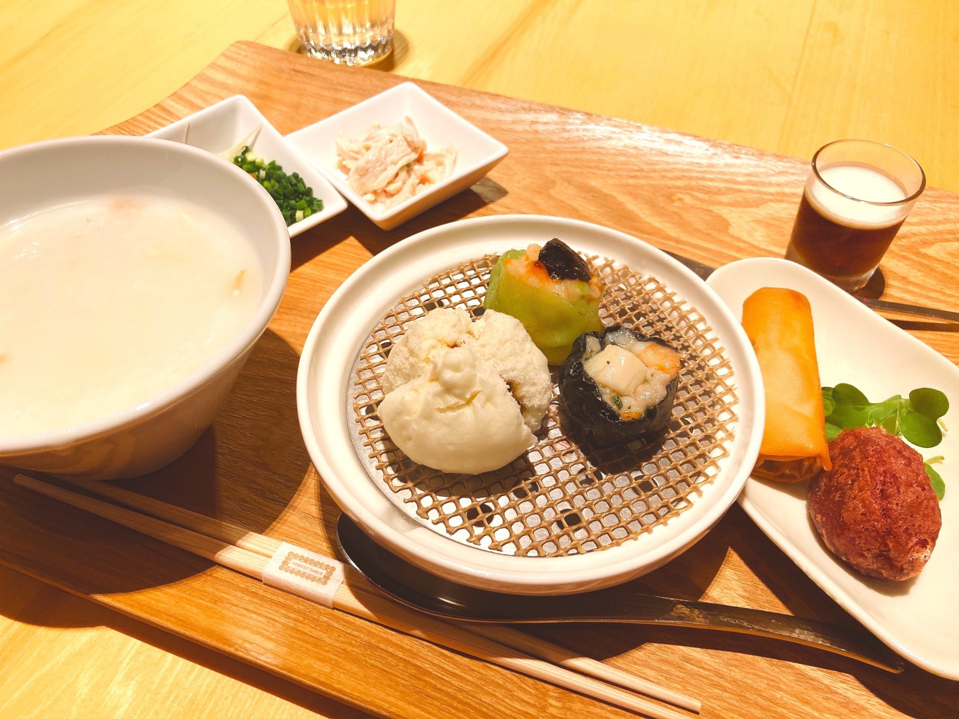 中華粥の薬味は、上品に細かく切ったあさつきや針生姜、蒸し鶏、揚げ春巻きの皮など。