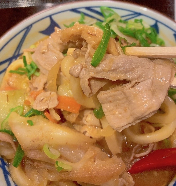 豚汁って、合わせみその白みそ味で甘く仕上がってるお店が多いと思うのですが、丸亀製麺は甘みではなくスパイスの味がきいた味。