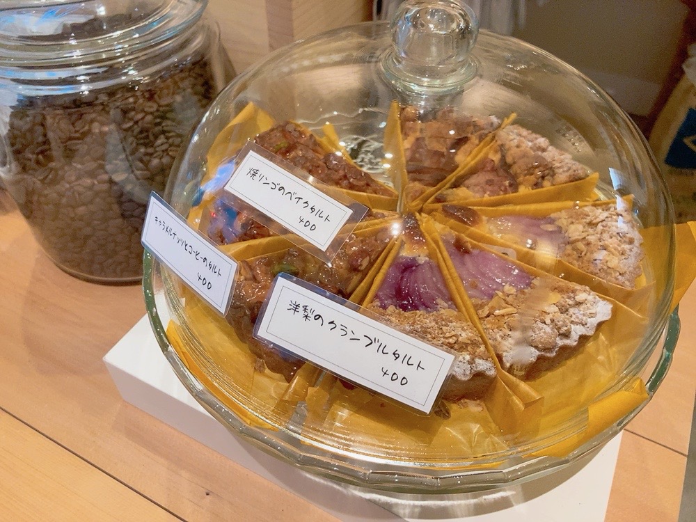 「焼きリンゴのベイクタルト」「キャラメルナッツとコーヒーのタルト」「洋梨のクランブルタルト」(以上400円)などのタルトがずらり。