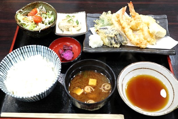 本町駅の東、丼池筋の本町通の少し南にある天ぷら屋さんです。 ランチタイム限定の週替わりの天ぷらセットをいただきました。 小えび2本、野菜、週替わりの天ぷらに、小鉢、赤出汁、サラダが付いて1000円、丼にも定食にもできます。 この時の週替わりはカマンベールチーズというめずらしいものでした。結構いけます。