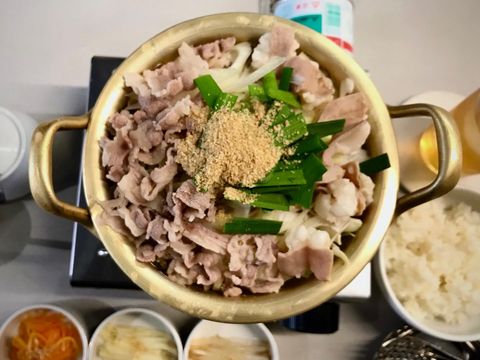 程なくして、名物飛鳥ホルモン鍋定食用のコンロと薬味とナムル3種がスタンバイ。