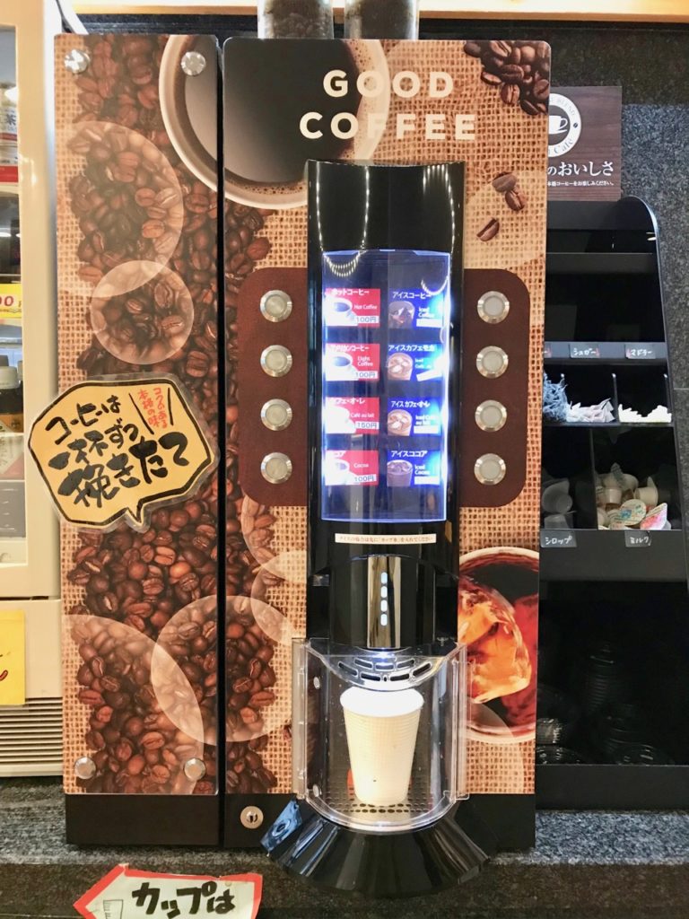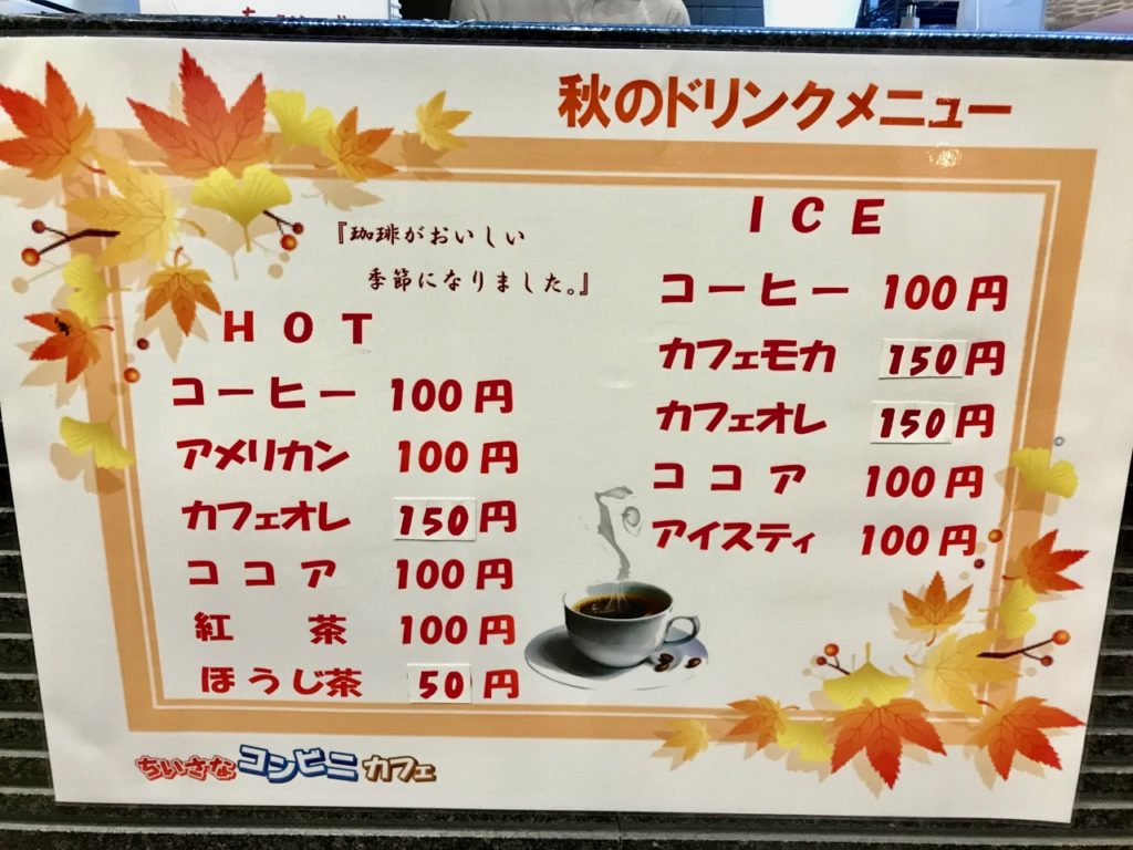 コーヒーやカフェオレ、ココア、紅茶、ほうじ茶などのドリンクが50〜150円とお手頃な価格で販売されています。